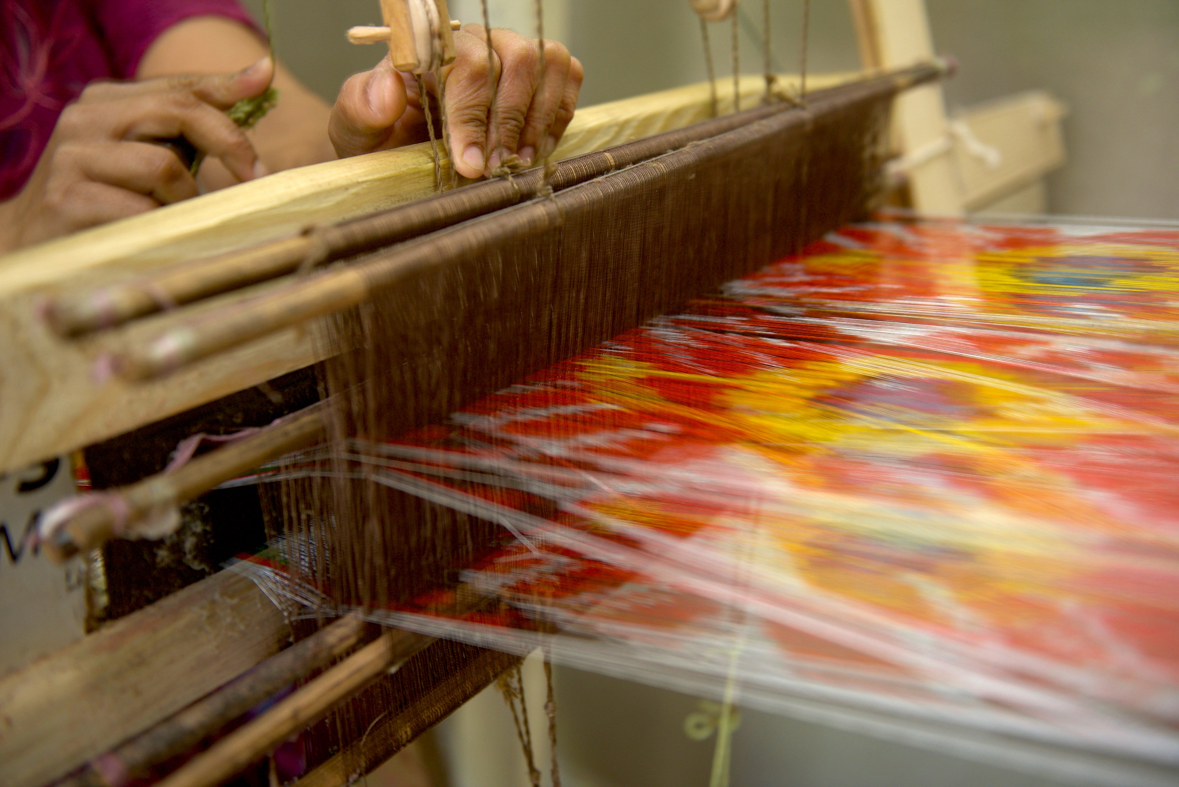 Once dyed, the threads are woven on traditional wooden looms, often operated by women artisans in small workshops across Uzbekistan. Every movement of the loom brings the fabric to life, thread by thread, day by day.