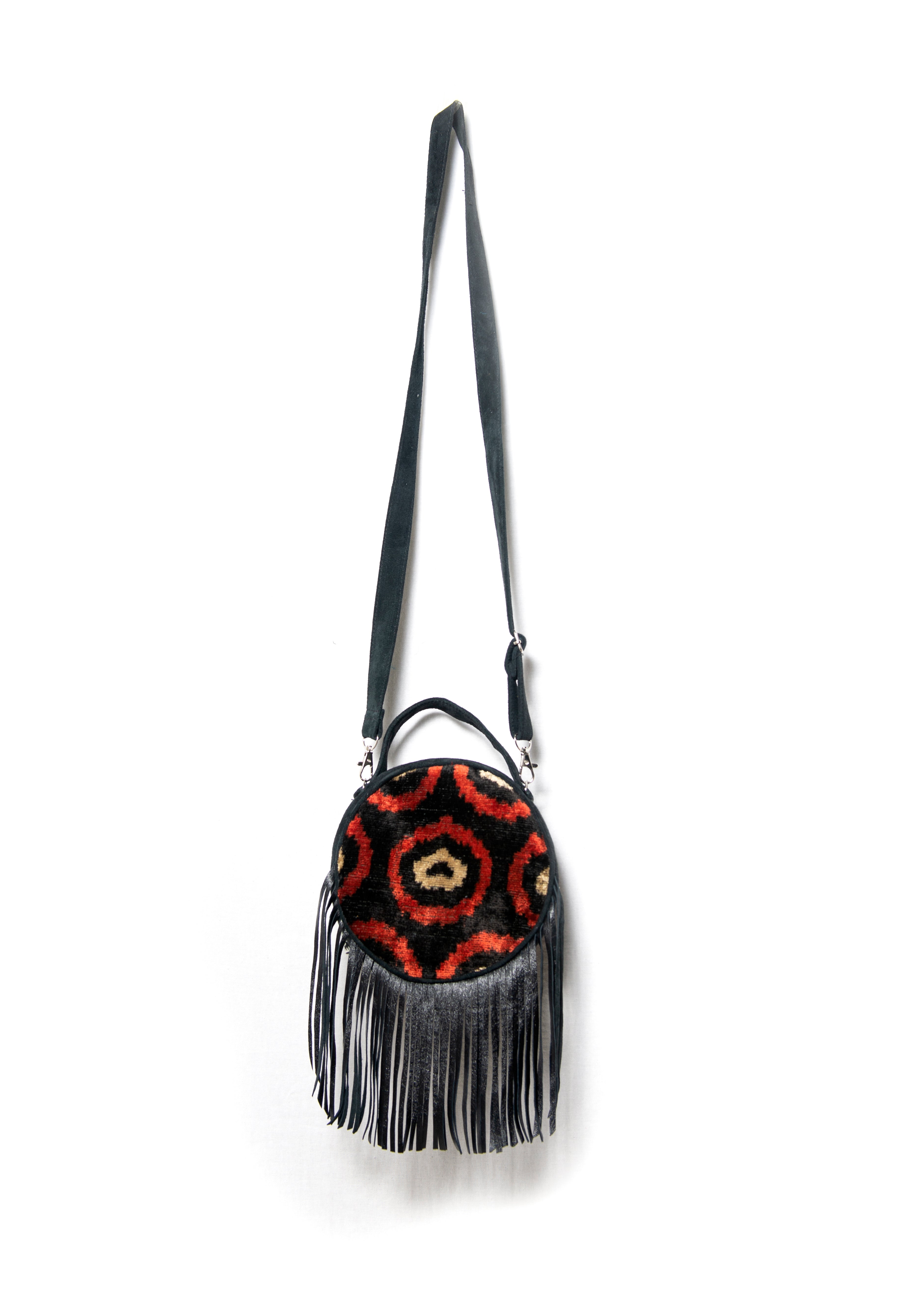 This shoulder bag is crafted from supple leather and 90% silk ikat velvet, blending enduring quality with refined elegance. The handwoven silk showcases intricate, traditional ikat patterns, while the leather provides structure and comfort. A sophisticated accessory that harmonizes artisanal heritage with everyday functionality.