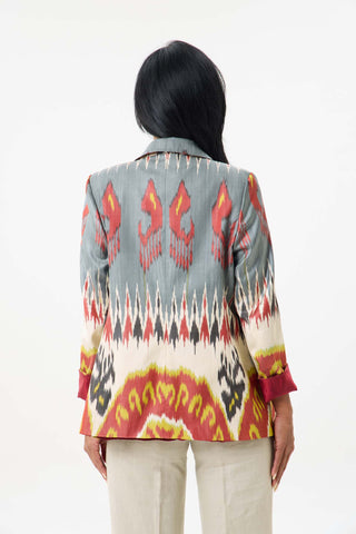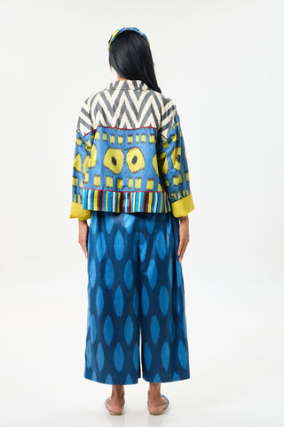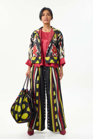 This coordinated silk ikat set blends architectural pattern with soft, natural drape. A refined balance of craftsmanship and contemporary style.