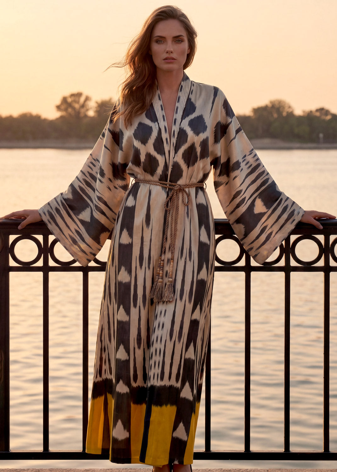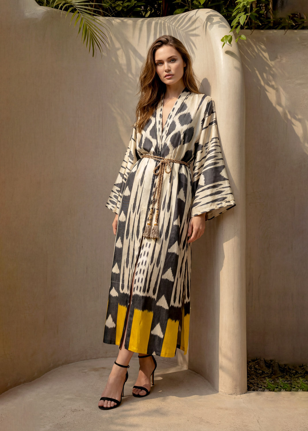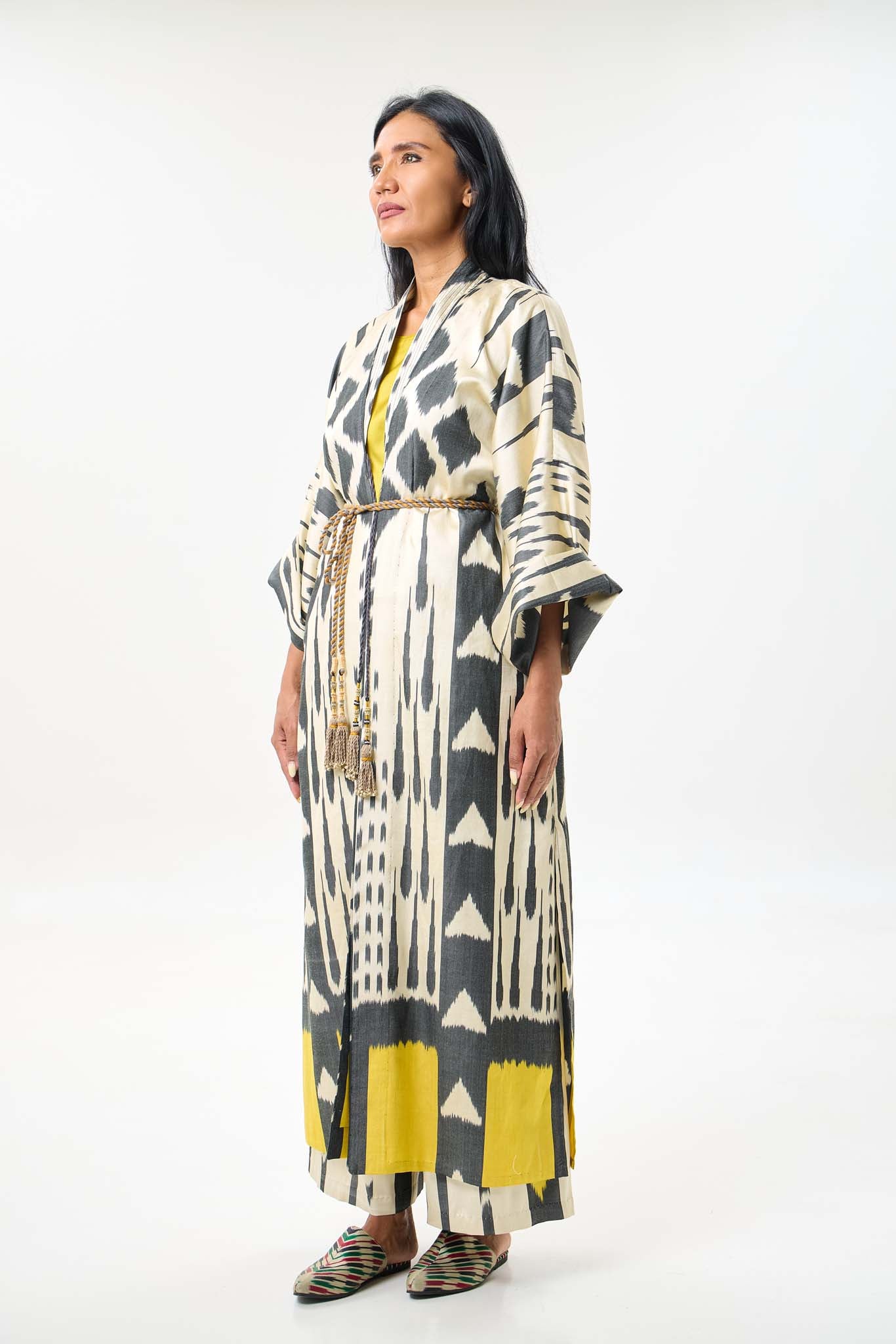 This lightweight duster is meticulously crafted from handwoven silk-cotton ikat, combining airy comfort with refined elegance. Designed for effortless layering, its flowing silhouette highlights the beauty of artisanal weaving, while the subtle texture and drape create a sophisticated, timeless piece — perfect for elevating both casual and polished ensembles.