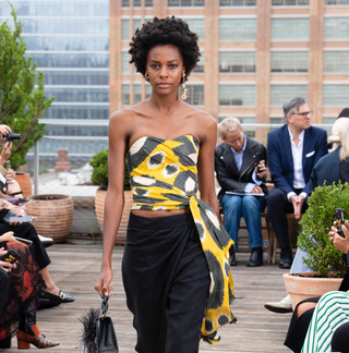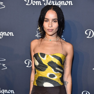 Zoe Kravitz wears a handwoven Ikat bandeau featuring fabric made by Bibi Hanum for Oscar de la Renta’s Spring-Summer 2019