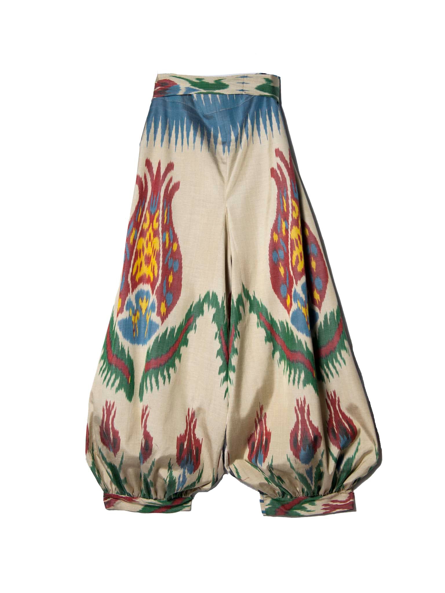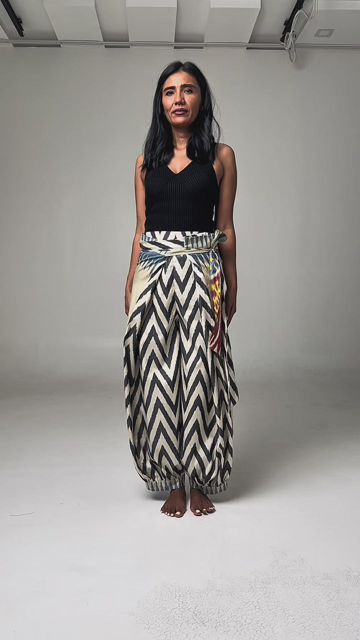 These wide-leg harem pants are crafted from handwoven silk-cotton ikat, thoughtfully combining two distinct patterns for a reversible design. Designed in a one-size fit with a wrap waistband, they offer effortless comfort, fluid movement, and versatile style — a refined piece that blends artisanal craftsmanship with relaxed sophistication.