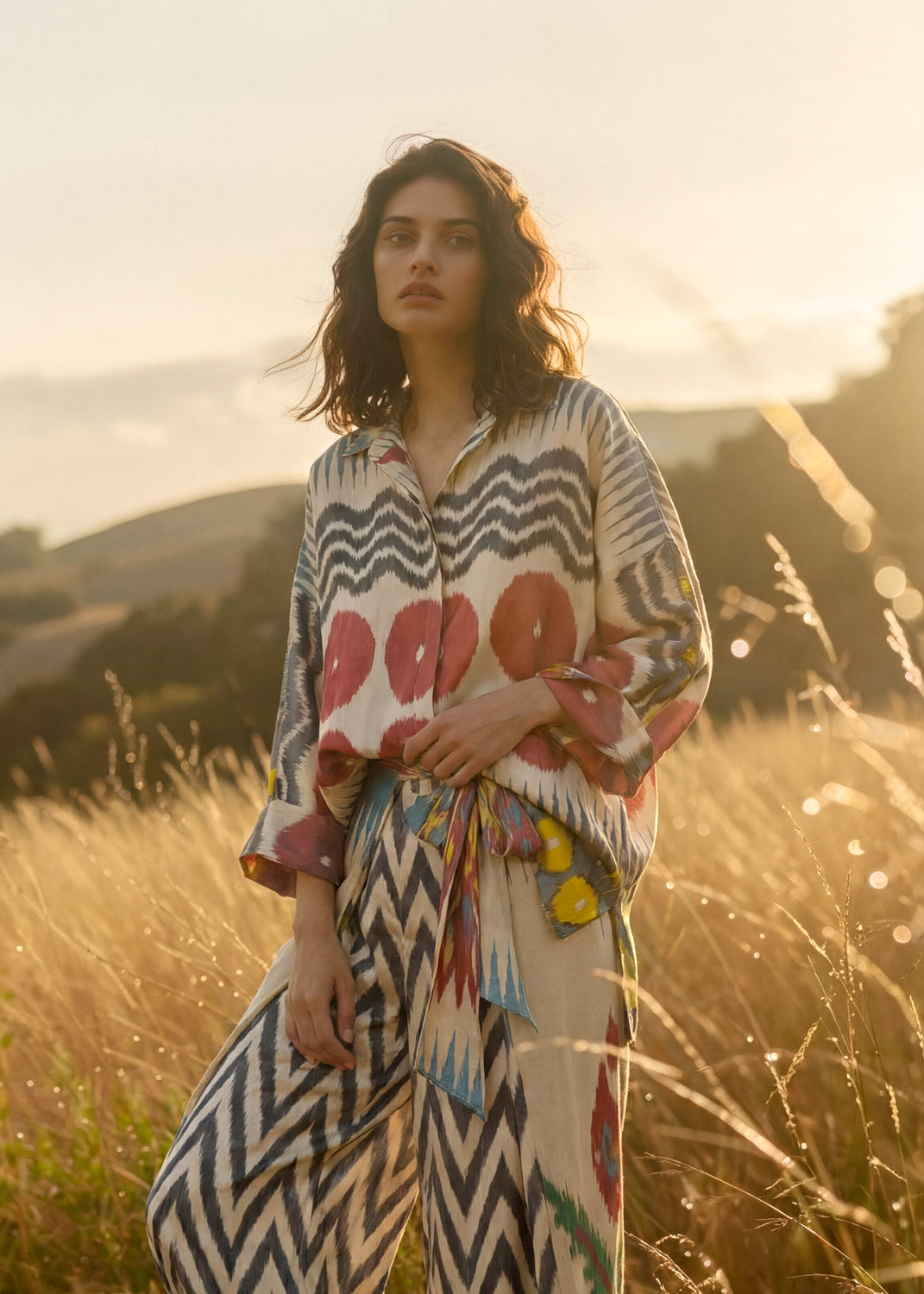 This versatile blouse is crafted from handwoven silk-cotton ikat, showcasing an asymmetric cut for a modern, elegant silhouette. Designed in a one-size fit, it features a graceful V-neckline, long sleeves with folded hems, and side slits for effortless movement — a refined piece that combines artisanal craftsmanship with contemporary ease.