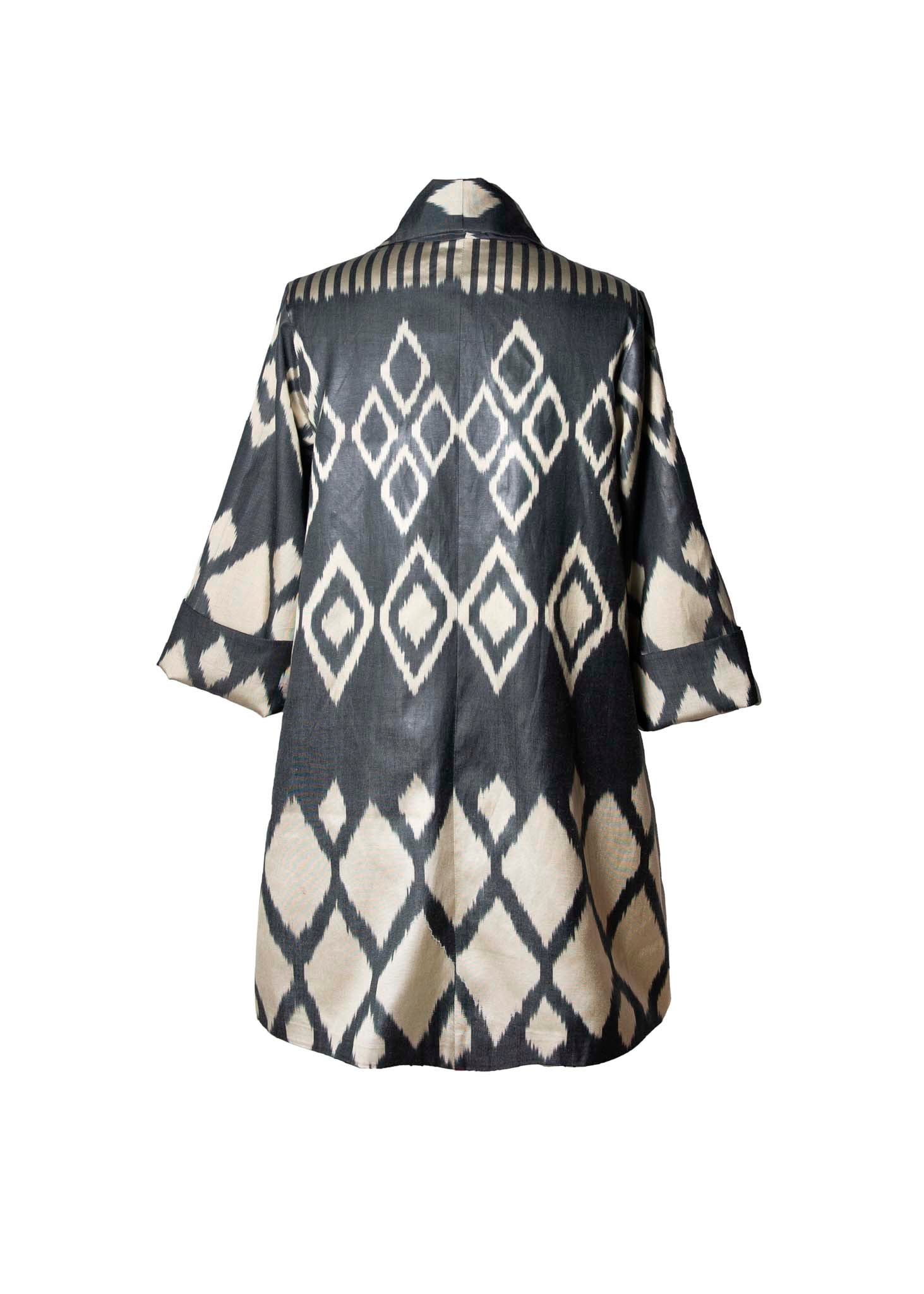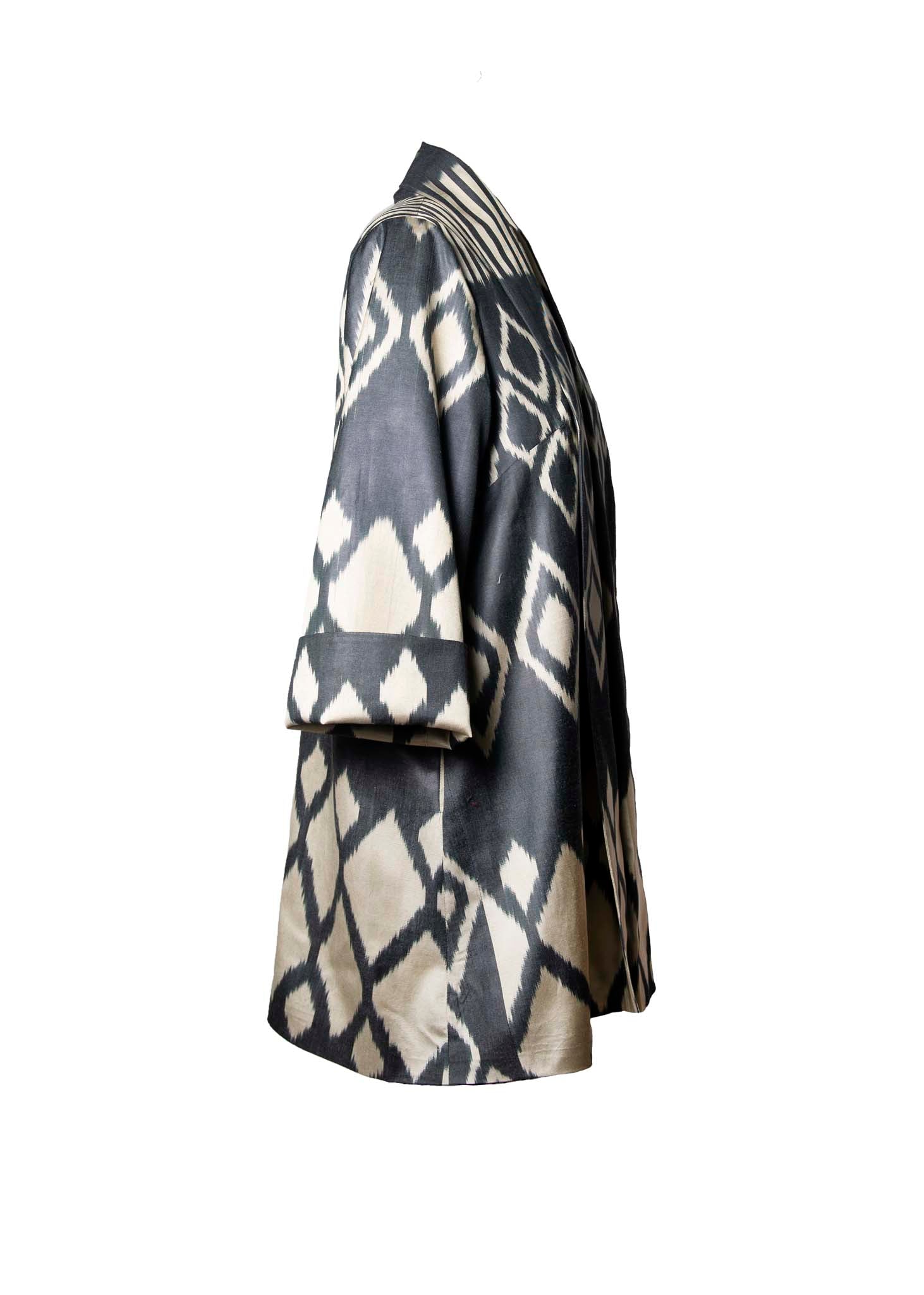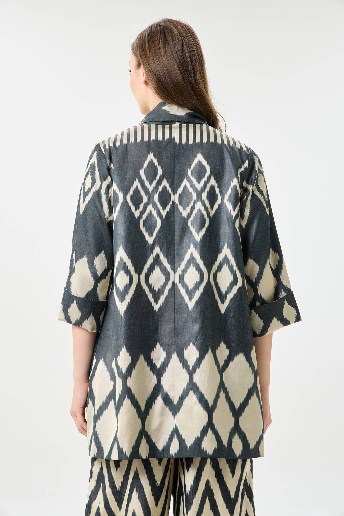 This A-line jacket carries the spirit of true craftsmanship. Woven from a luxurious silk–cotton blend, each thread is hand-dyed and handwoven in the age-old ikat tradition — a process where artisans paint color onto yarn before it ever becomes fabric, creating patterns that exist only once.