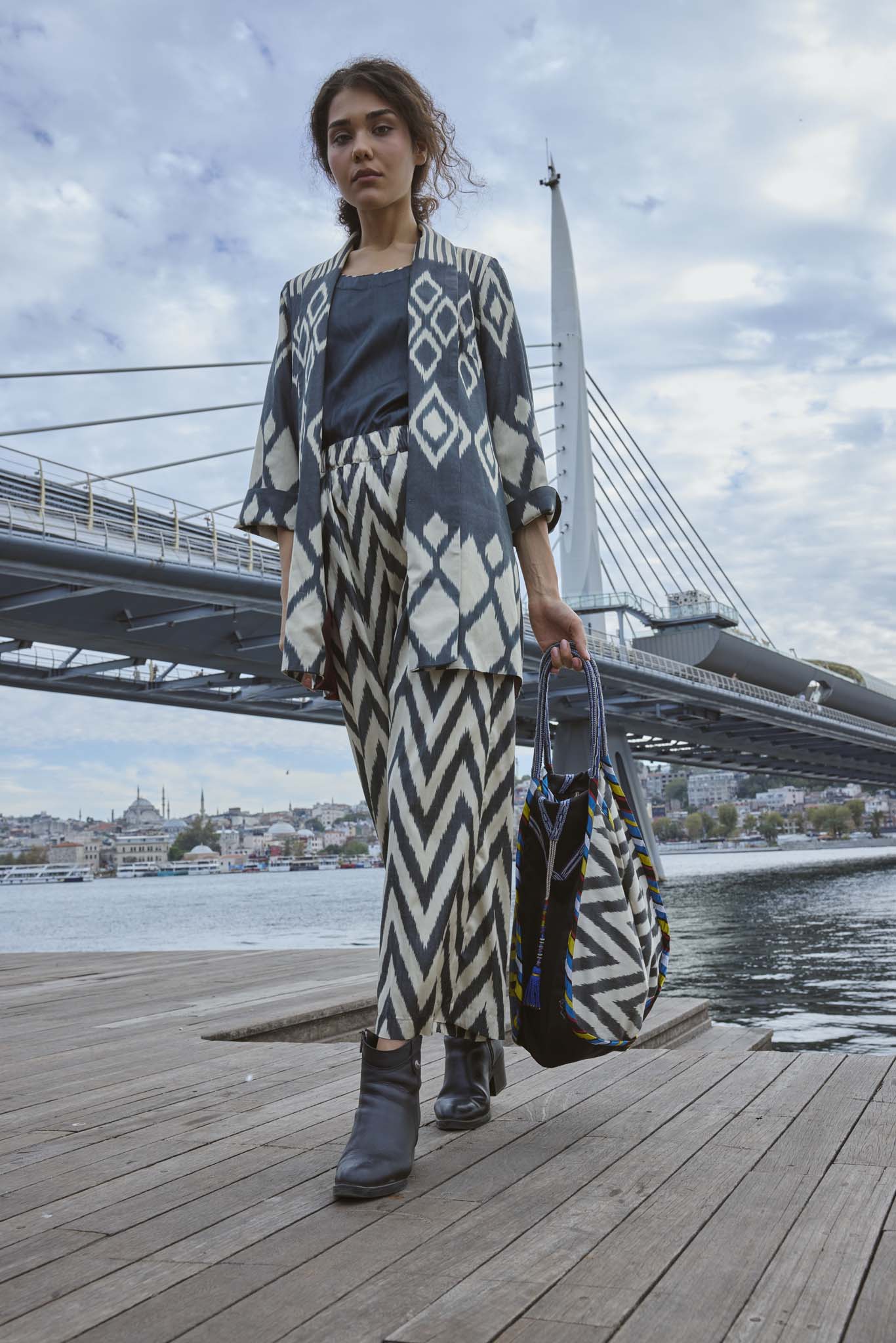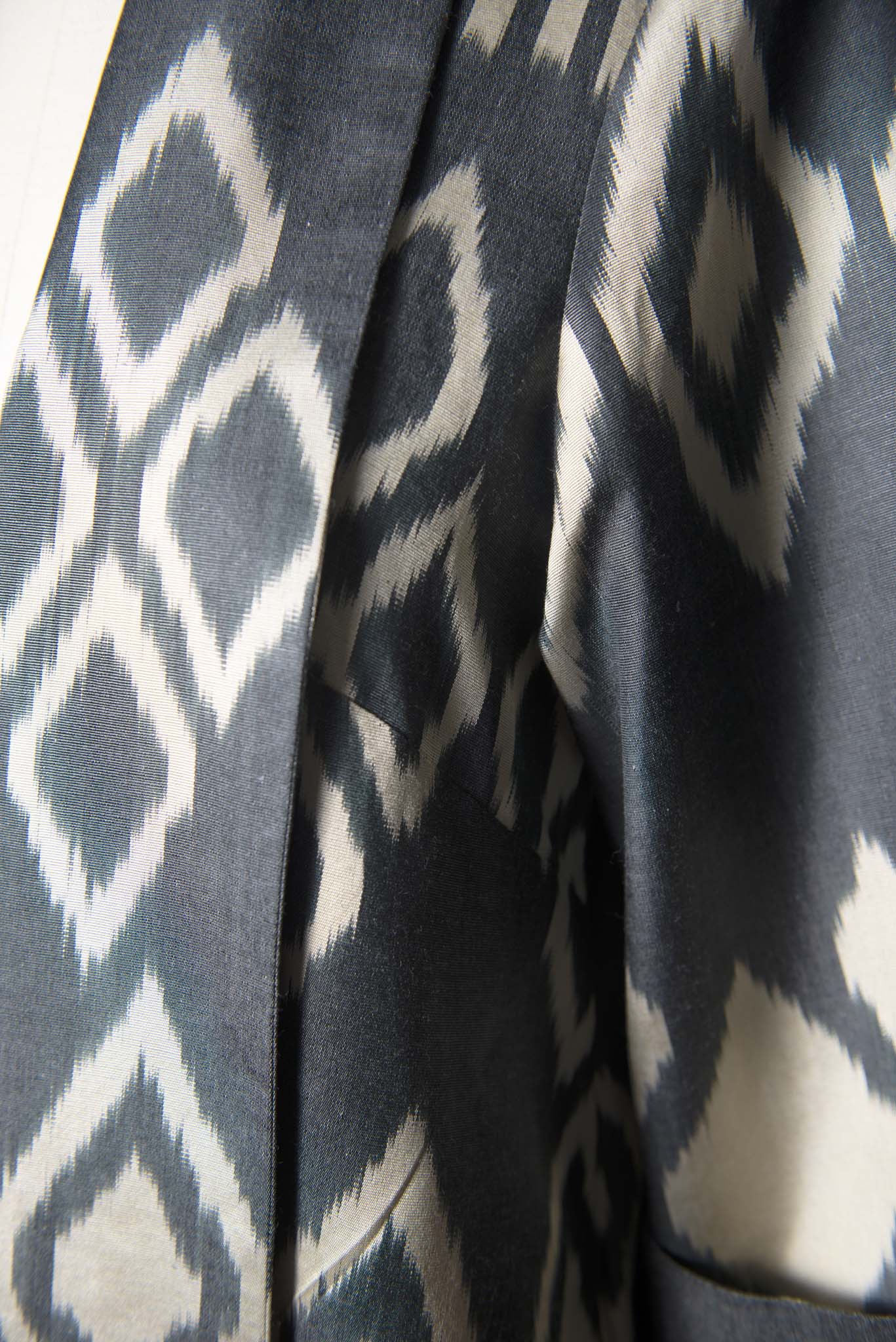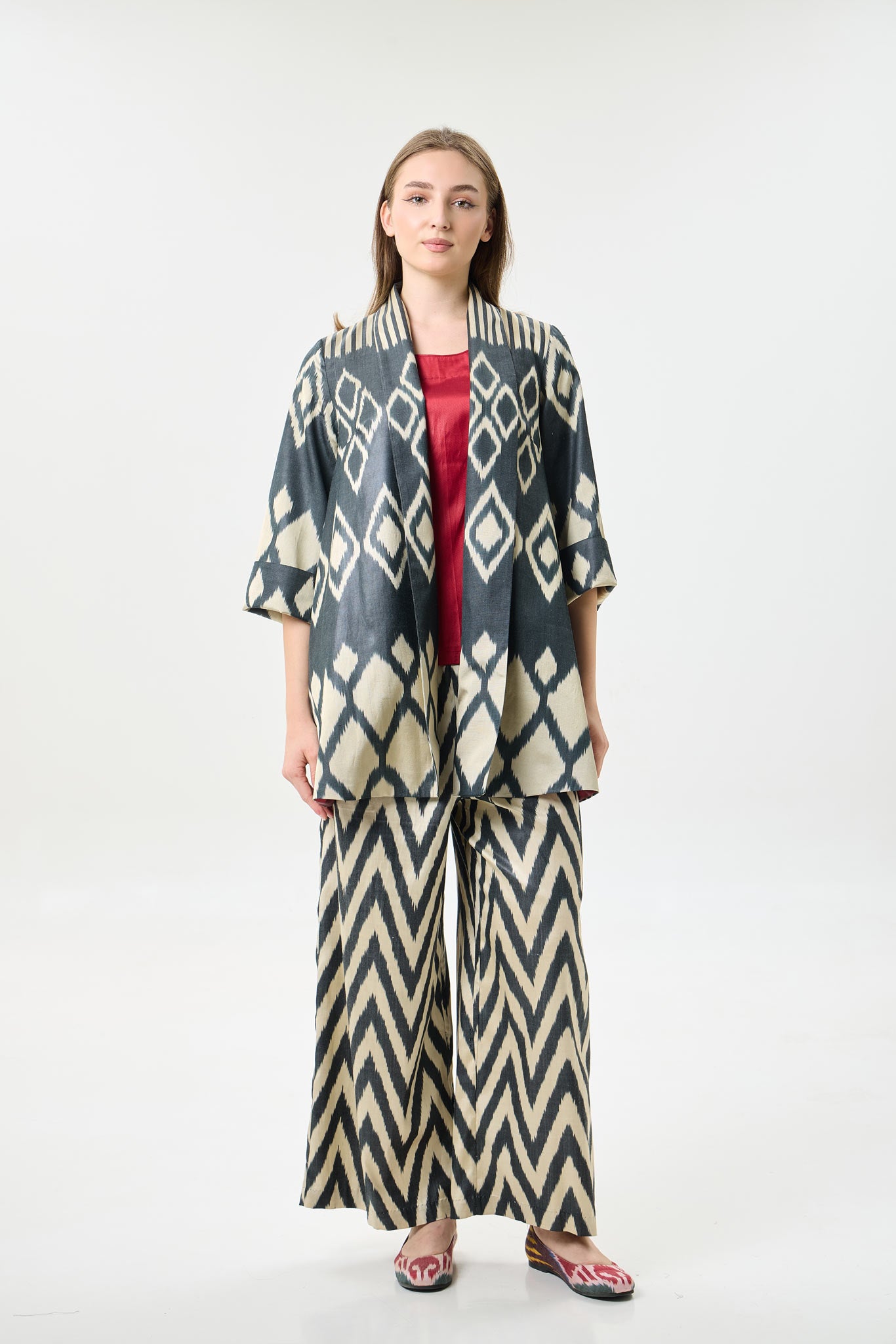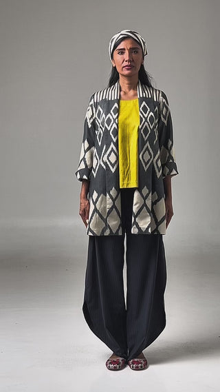 This A-line jacket carries the spirit of true craftsmanship. Woven from a luxurious silk–cotton blend, each thread is hand-dyed and handwoven in the age-old ikat tradition — a process where artisans paint color onto yarn before it ever becomes fabric, creating patterns that exist only once.