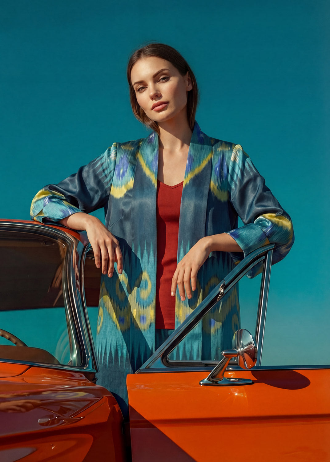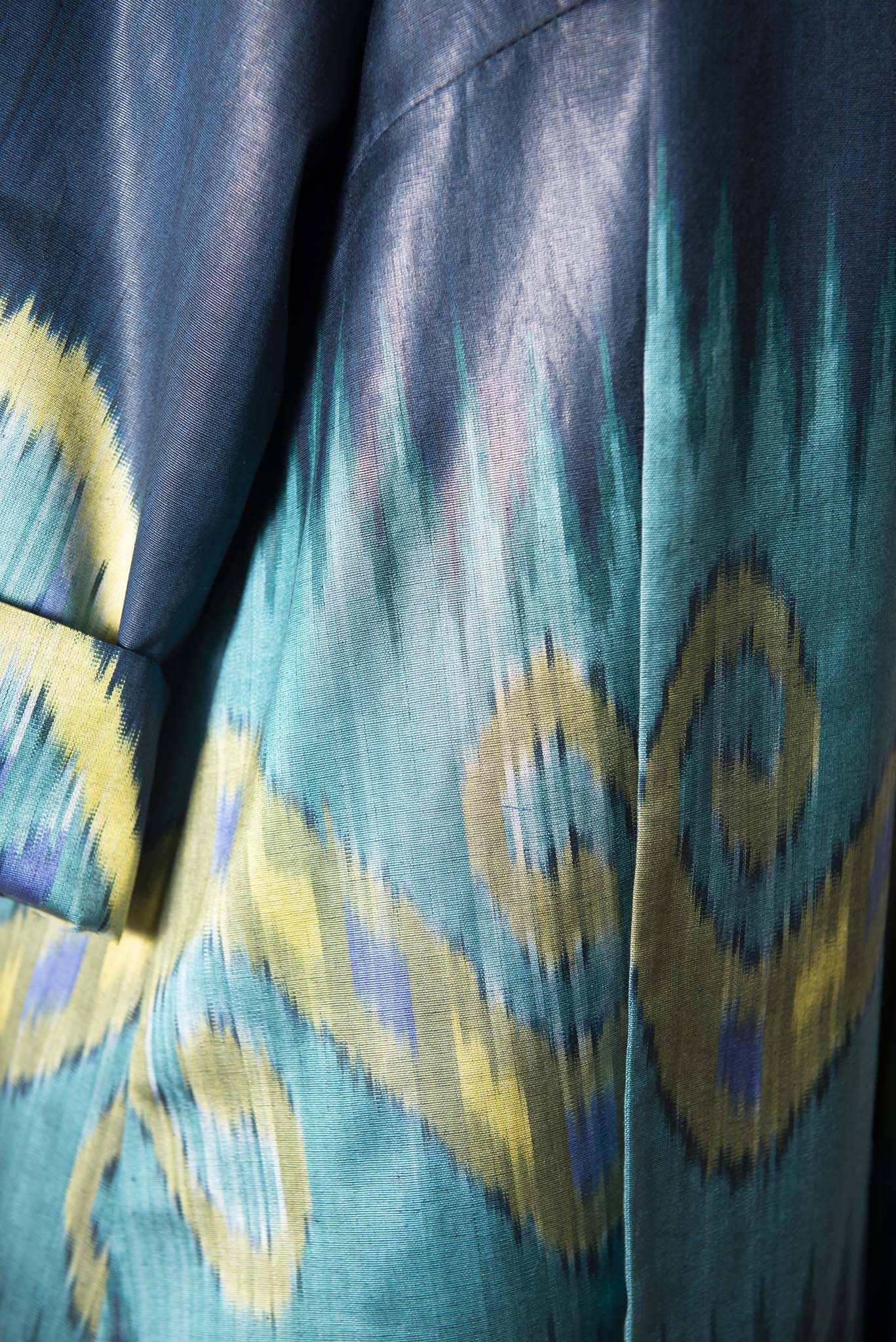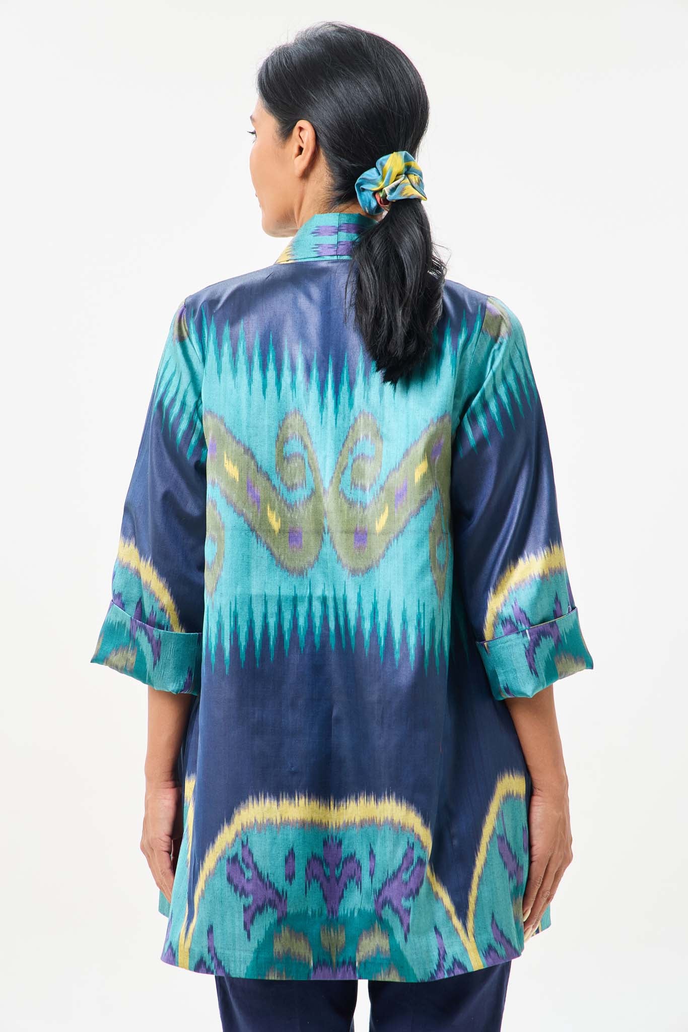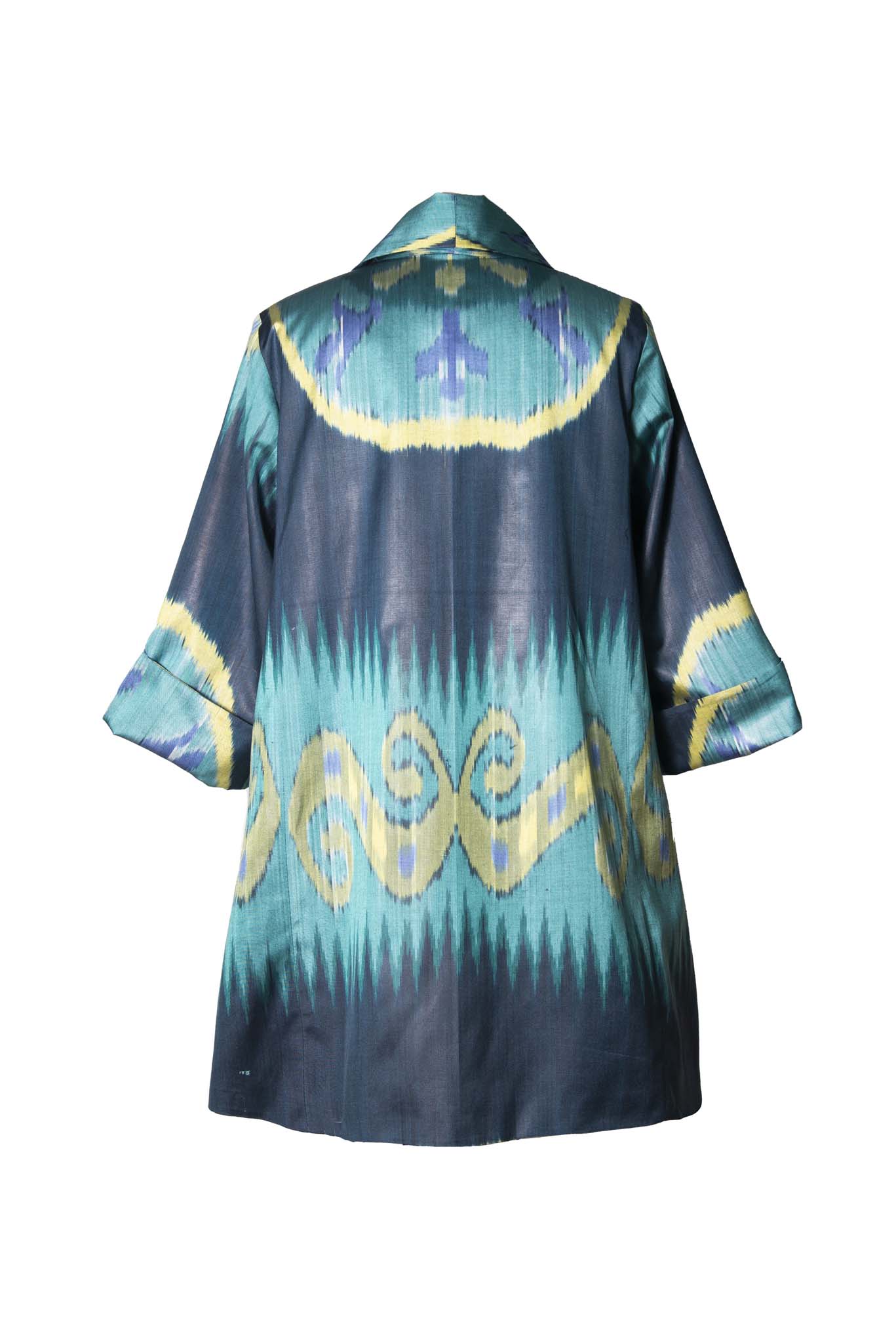 This A-line jacket carries the spirit of true craftsmanship. Woven from a luxurious silk–cotton blend, each thread is hand-dyed and handwoven in the age-old ikat tradition — a process where artisans paint color onto yarn before it ever becomes fabric, creating patterns that exist only once.