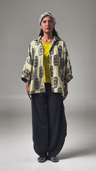 This batwing blouse is crafted from handwoven silk ikat, showcasing an elegant blend of fluidity and structure. Designed in a versatile one-size fit, it features a graceful V-neckline, asymmetric fabric cut, and long sleeves finished with elastic cuffs and folded hems. Side slits add ease of movement, making it a refined yet effortless piece for any occasion.