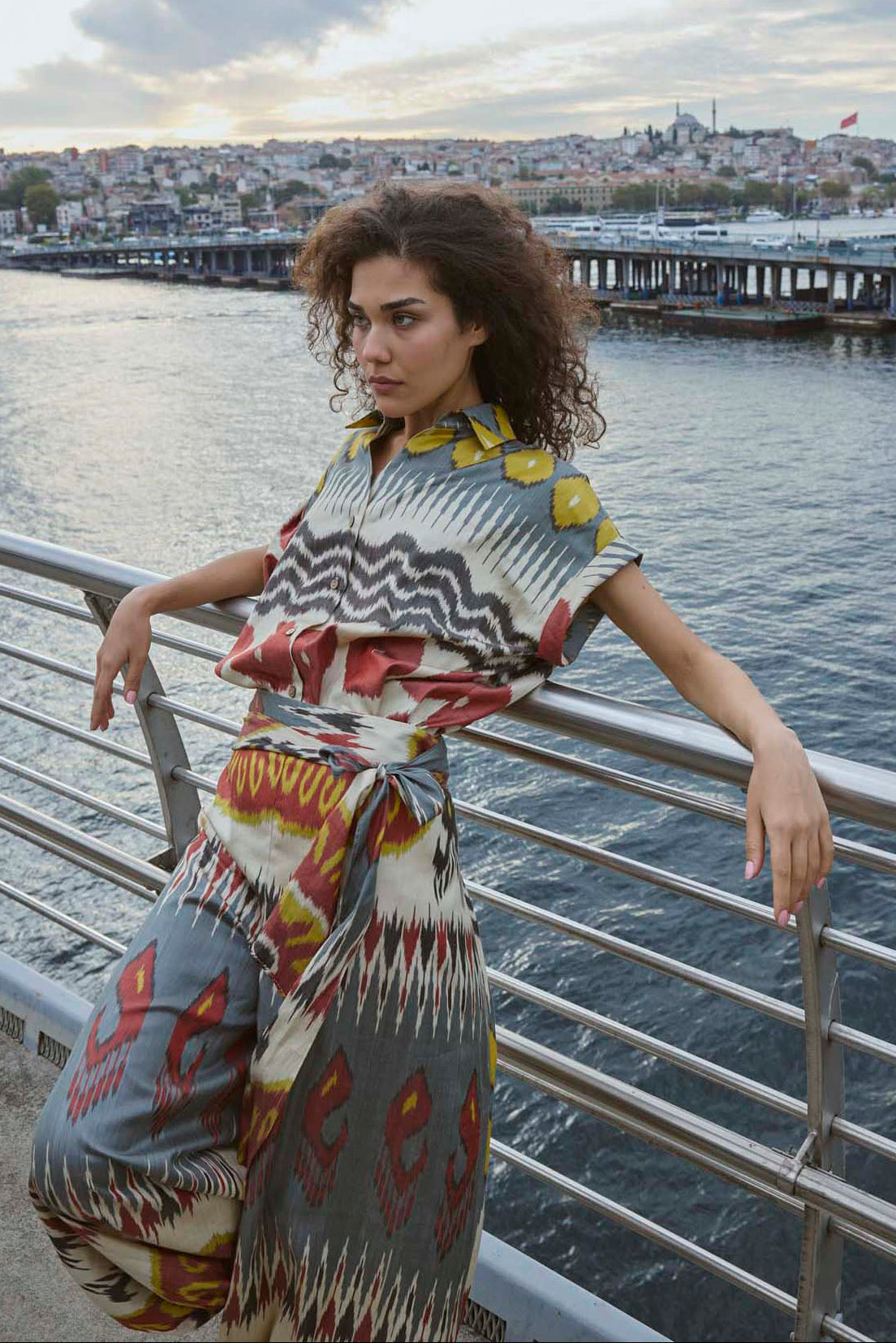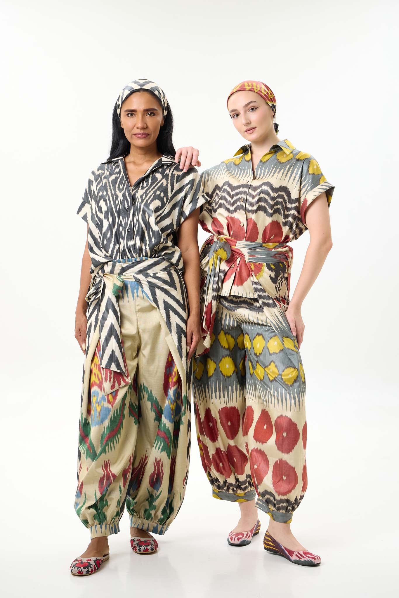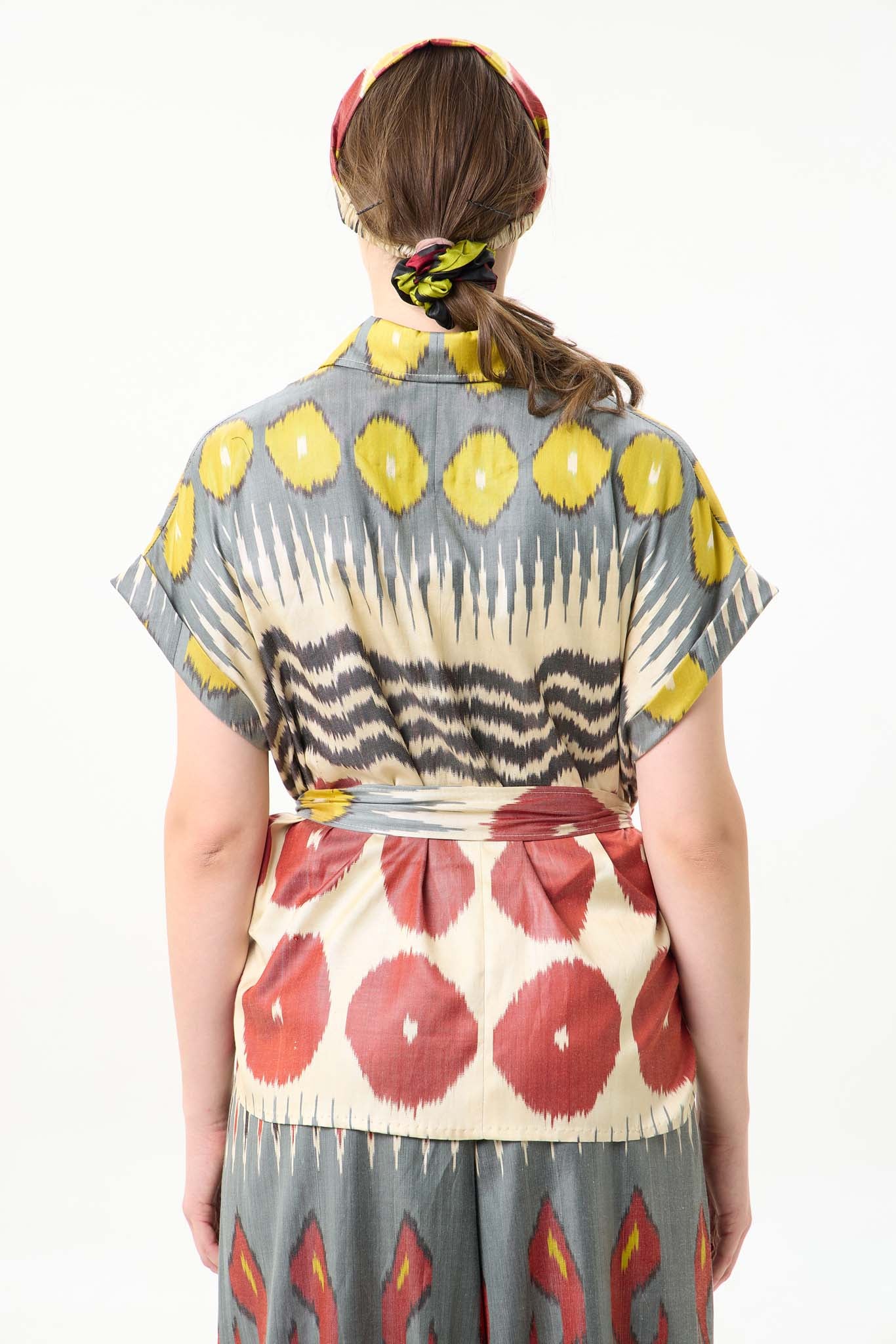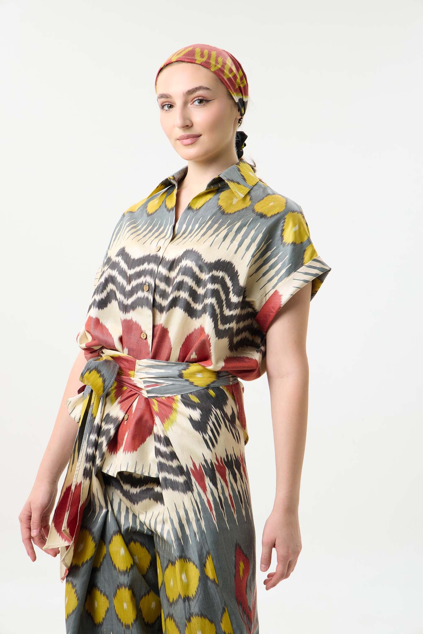 This silk ikat top carries the quiet poetry of handmade craft. Each thread is hand-dyed and handwoven, giving the fabric its own rhythm and character — no two pieces are ever the same.
