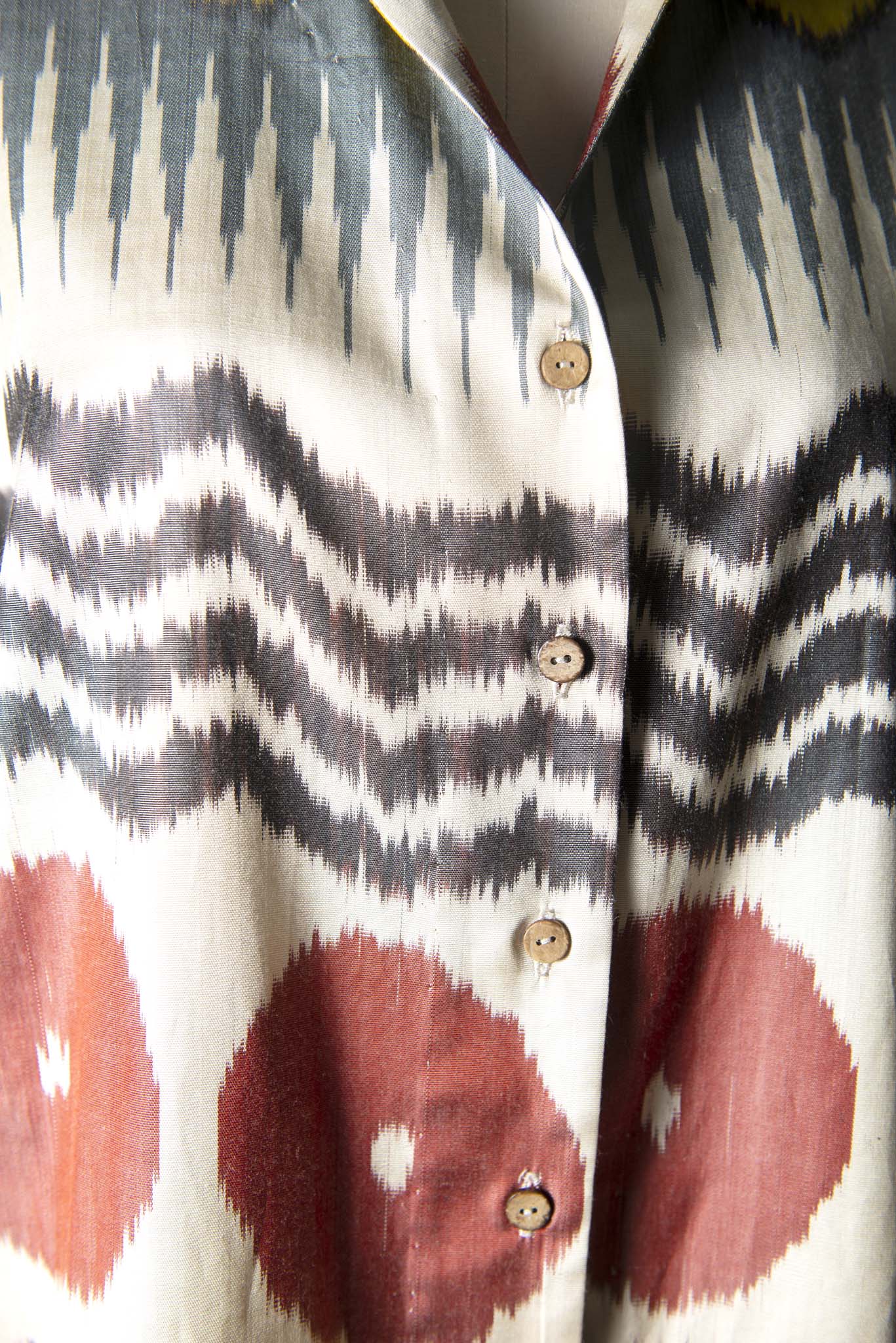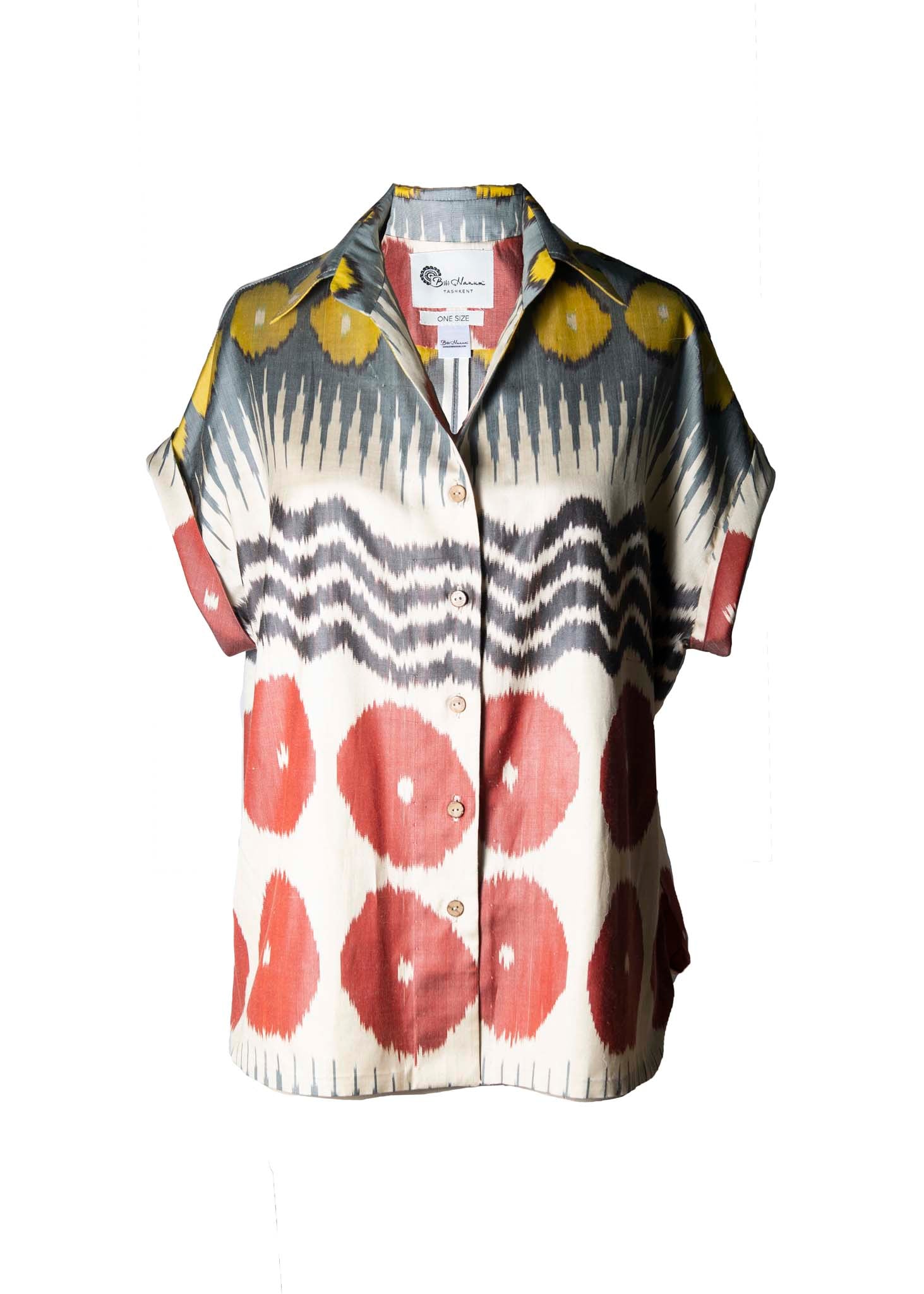 Its relaxed drop-shoulder silhouette and one-size design drape effortlessly, while the classic collar, ikat-covered buttons, and gentle side slits add touches of understated grace.