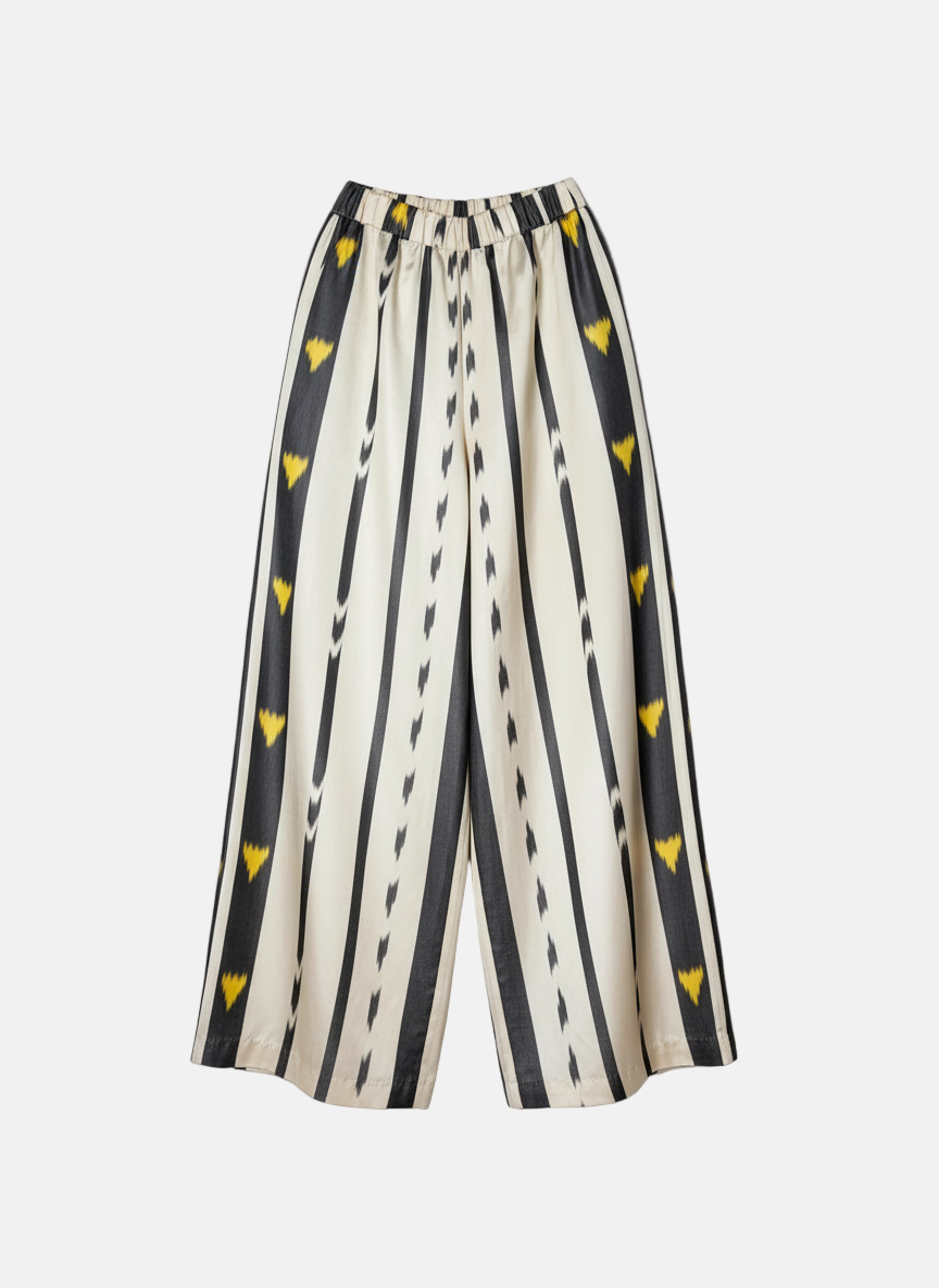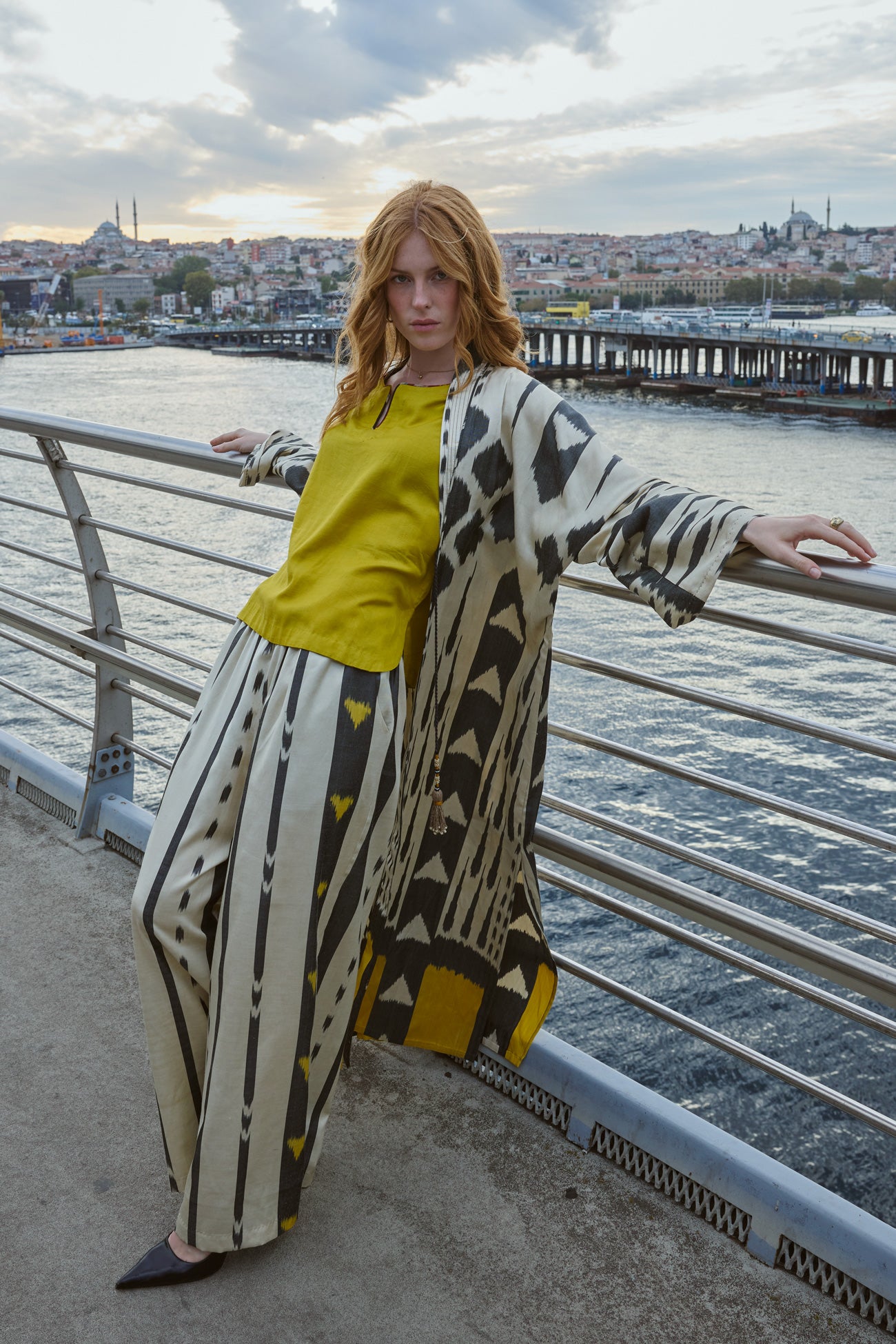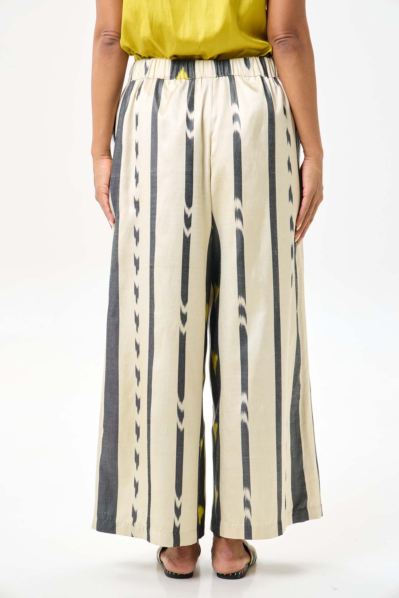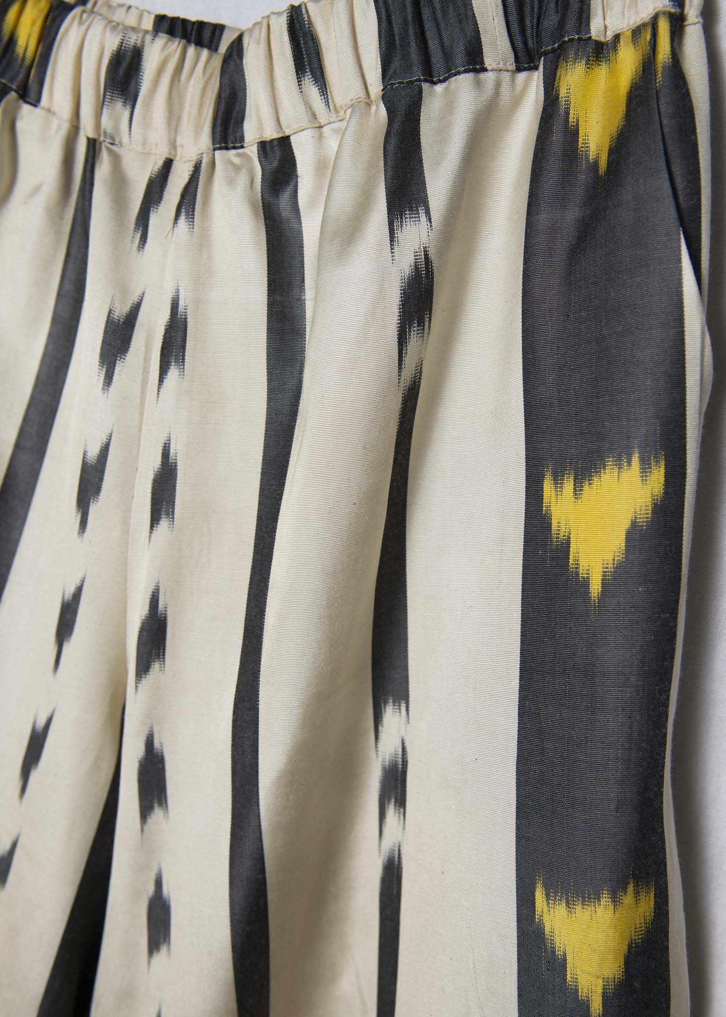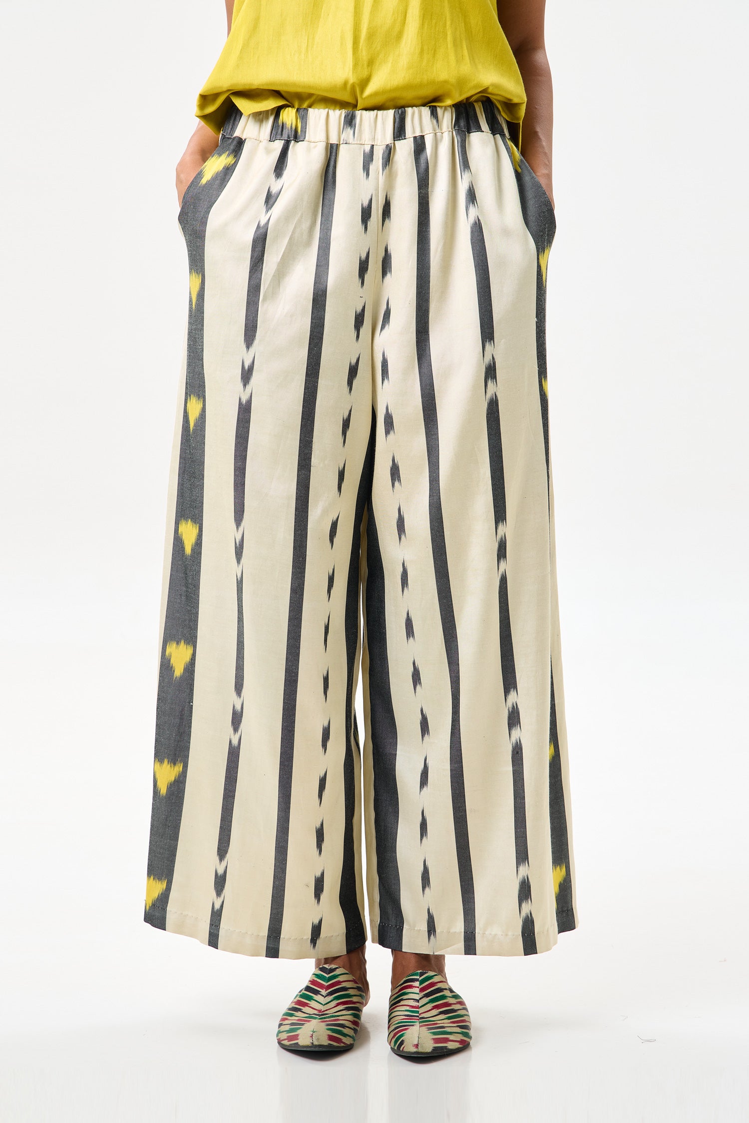 Crafted from breathable handwoven fabric with intricate ikat patterns, these pants offer a refined blend of comfort and sophistication. Their versatile design pairs effortlessly with a variety of tops, making them suitable for both casual and semi-formal occasions, while showcasing timeless artisanal craftsmanship and a distinctive cultural touch.